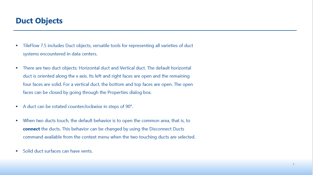 TileFlow constructs a computer model of the data center and uses the technique of Computational Fluid Dynamics (CFD) to calculate the airflow and pressure/temperature distributions. TileFlow is a reliable, quick, and cost-effective tool for: